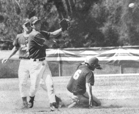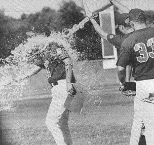 | Fair Oaks players "congratulate" coach Don Barney immediately after the last out of Sunday's championship game at Renfree Field. Photo by John Blenkle |