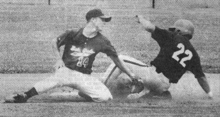 | Fair Oaks Post 383's Garrett Schoenfelder puts the tag on an Auburn runner during an attempted steal in the seventh inning of Fair Oaks' game at Bella Vista High School. Fair Oaks was a 10-3 winner. Photo by John Blenkle |