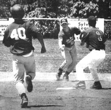 | Fair Oaks shortstop Dennis Hunt tosses the ball to second baseman Reagan Reynolds to start a sixth inning double play in Post 383's game Sunday against Elk Grove. Post 383 won the game 13-3 to sweep the three-game series from Elk Grove and move to 14-5 on the season. Photo by John Blenkle |