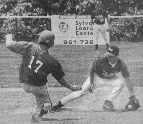 | Post 383's Reagan Reynolds takes the throw at second base on a seventh inning steal attempt in Sunday's second game of a doubleheader against Cordova. Catcher Jason Wilkerson pegged the throw to Reynolds for the third out of the inning. Photo by John Blenkle |