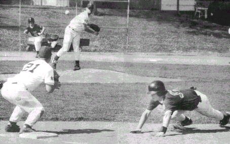 | Post 383's Jason Currier dives back into first base ahead of a pickoff throw in the fourth inning of Saturday's first game of a doubleheader against Charles Eggen. Currier got on base on an error as Post 383 went up 5-1 in the inning. Fair Oaks later lost the game 8-6, but came back to win the second game of the twin bill 5-4 and also picked up a win in Sunday's solo contest, 12-6. Photo by John Blenkle |